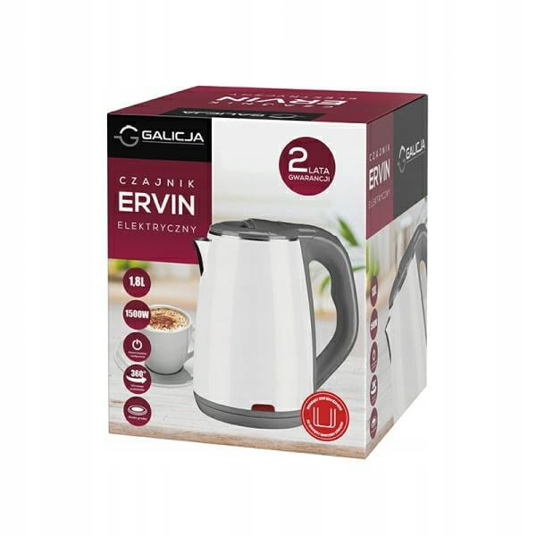 Czajnik elektryczny Ervin 1,8 L biały ze stali nierdzewnej i tworzywa sztucznego. Moc 1500W, obrotowa podstawa, automatyczne wyłączanie i płaska grzałka.
