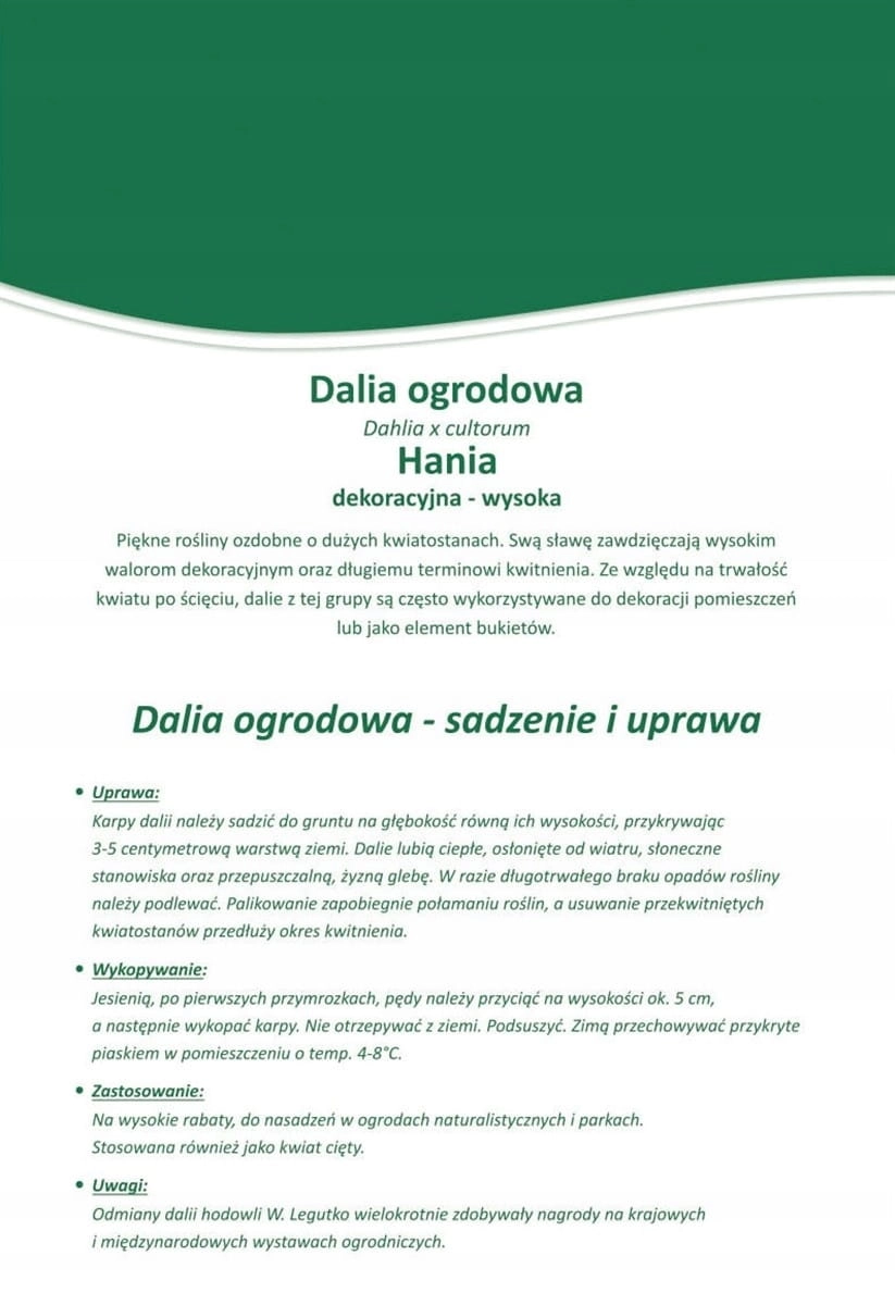 Dalia ogrodowa Hania (Dahlia x cultorum) to efektowna, wysoka odmiana o dużych, intensywnie wybarwionych kwiatach. Zachwyca obfitym i długim kwitnieniem, stanowiąc wyrazisty akcent na rabatach oraz w kompozycjach naturalistycznych. Doskonale sprawdza się również jako kwiat cięty do bukietów.