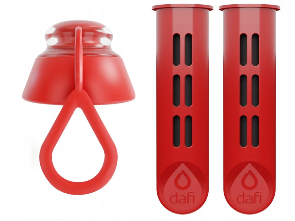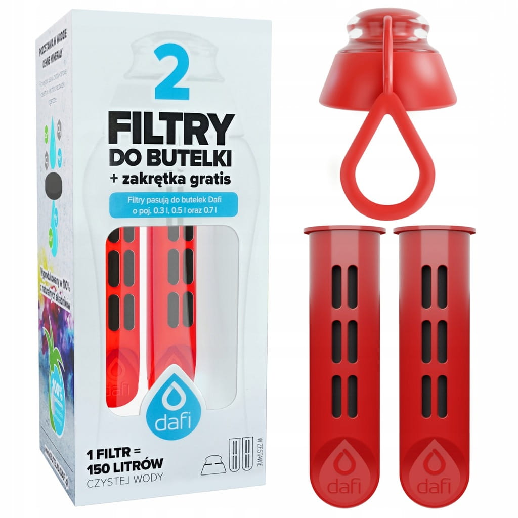 W zestawie znajdziesz 2 filtry oraz nakrętkę / ustnik w kolorze makowym (czerwonym), które pasują do wszystkich butelek filtrujących Dafi. To komplet, który zapewni Ci świeżą wodę na wiele tygodni, w domu, w pracy i w podróży.