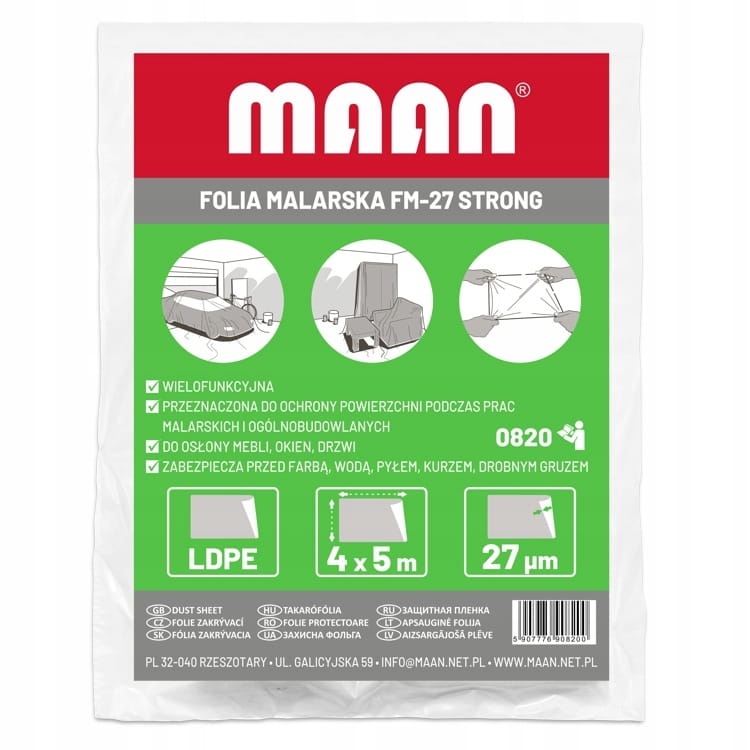 Folia skutecznie chroni podłogi, meble, okna, drzwi i sprzęty przed farbą, pyłem, wilgocią oraz brudem. Świetnie sprawdzi się zarówno w zastosowaniach profesjonalnych, jak i domowych — podczas malowania, szlifowania, wiercenia czy prac wykończeniowych.