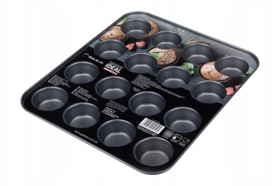 Praktyczna forma IDEAL na 16 muffinek lub babeczek. Wykonana ze stali z powłoką nieprzywieralną, zapewnia równomierne pieczenie i łatwe wyjmowanie wypieków.