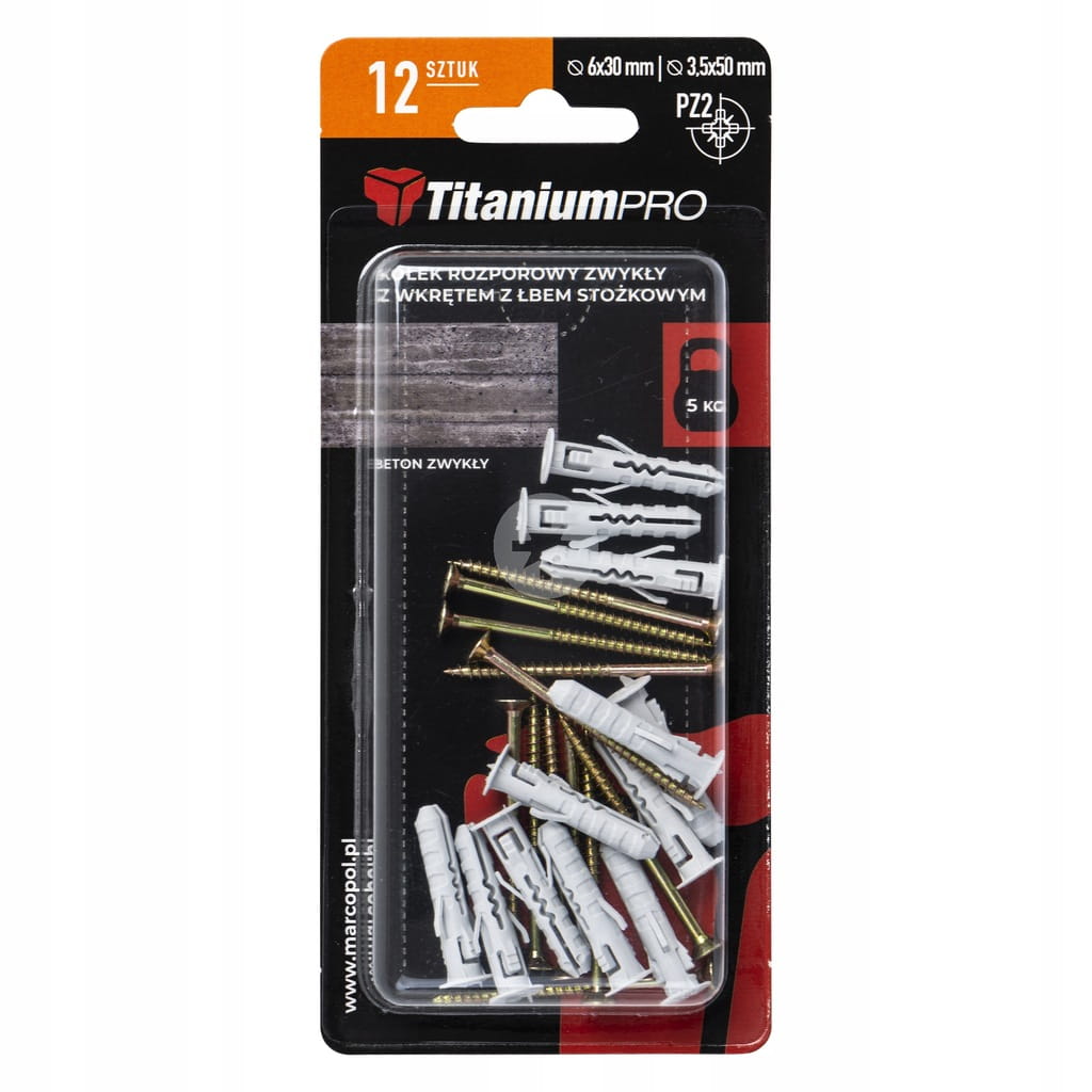 Zestaw 12 kołków rozporowych 6x30 mm wraz z wkrętami 3,5x50 mm, przeznaczonych do montażu w betonie. Idealne do solidnego mocowania różnych elementów budowlanych i instalacyjnych.