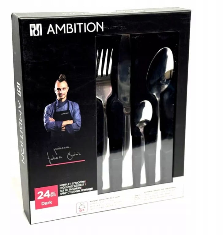 Ambition Dark 24 el. to stylowy komplet sztućców, który doskonale uzupełni każdą zastawę stołową, łącząc ponadczasową prostotę z elegancją.