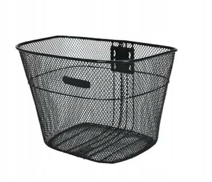 Czarny metalowy kosz rowerowy o wymiarach 34x24x24 cm, solidny i łatwy w montażu. Idealny do przewożenia zakupów, bagażu i drobnych przedmiotów podczas jazdy.