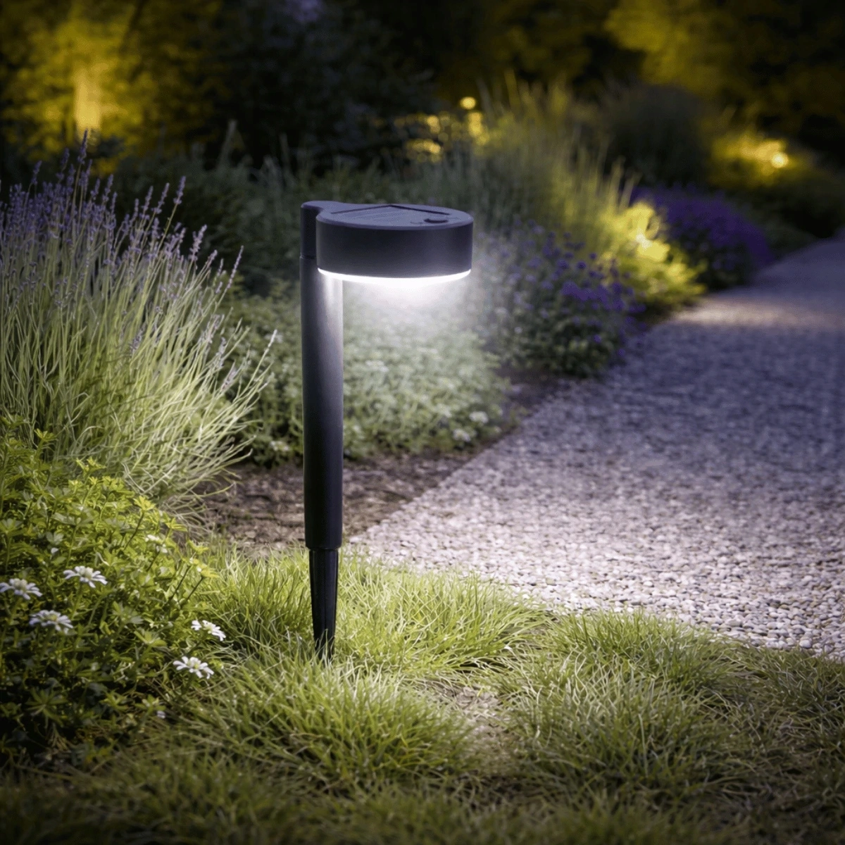 Minimalistyczna konstrukcja oraz elegancki czarny kolor sprawiają, że lampka doskonale komponuje się z nowoczesnymi aranżacjami ogrodowymi. Światło skierowane w dół subtelnie oświetla wybrane elementy przestrzeni, tworząc przyjemny efekt dekoracyjny.