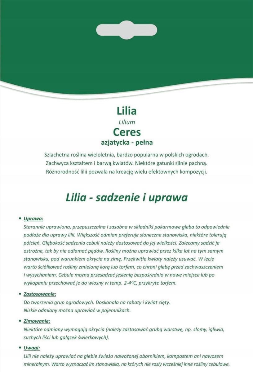 Lilia azjatycka pełna Ceres to wyjątkowa odmiana o głębokiej, czerwonej barwie kwiatów i eleganckim, pełnym kształcie. Stanowi mocny akcent kolorystyczny w ogrodzie i doskonale prezentuje się zarówno w kompozycjach rabatowych, jak i w bukietach.