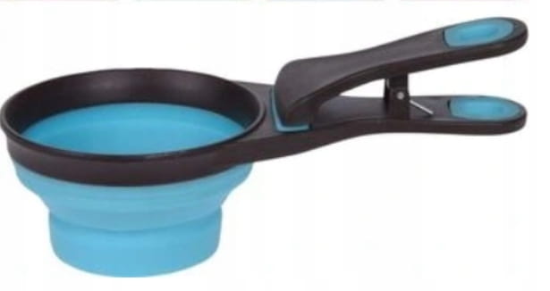 - nakładania oraz szczelnego zamknięcia worka z karmą. Zwierzak zawsze może dostać idealnie odmierzoną porcję jedzenia, dzięki czemu możemy zapobiec przejedzeniu oraz nadwadze, co pomaga utrzymać pupila w dobrej formie i zdrowiu. Wygodny antypoślizgowy klips umożliwia szczelne zamknięcie worka z karmą, zapewniając jej świeżość i dobry smak. Miarka jest składana i zajmuje mało miejsca dzięki temu bardzo dobrze sprawdzi się podczas podróży.