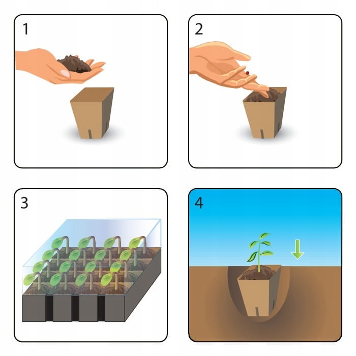 Wielodoniczki wykonane są w 100% z naturalnych surowców i są biodegradowalne. Po przesadzeniu ulegają rozkładowi w podłożu, co minimalizuje stres roślin i eliminuje konieczność wyjmowania sadzonek z doniczek. Dzięki temu rozsady tworzą zwarte i silne bryłki korzeniowe.