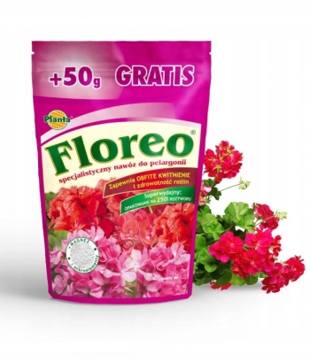 Floreo to nowoczesny nawóz NPK o wysokiej jakości, wzbogacony o mikroskładniki pokarmowe, dedykowany do zasilania wszystkich gatunków pelargonii w uprawach balkonowych oraz ogrodowych. Dzięki starannie dobranym proporcjom składników, nawóz Floreo zapewnia obfite i długotrwałe kwitnienie. Wysoka zawartość magnezu wspiera odporność roślin na choroby oraz wpływa na prawidłowe wybarwienie kwiatów. Nawóz Floreo jest w formie skrystalizowanej, całkowicie rozpuszczalny w wodzie i łatwo przyswajalny przez rośliny.