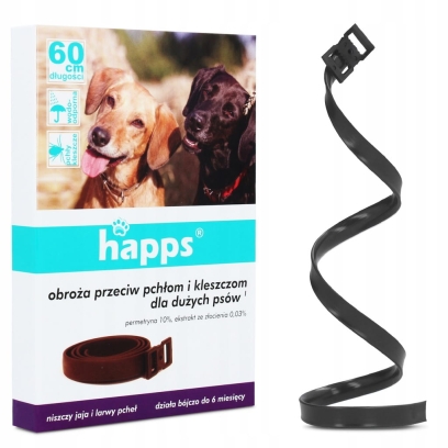 Obroża Happs skutecznie chroni psy przed pchłami i kleszczami do 6 miesięcy. Długość 60 cm, odporna na wodę, bezpieczna dla pupila.