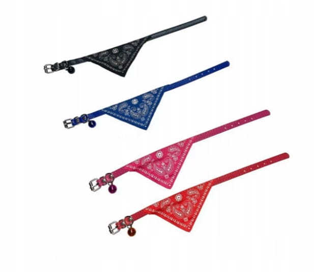 Modna, malutka obroża z przyszytą bandamką. Obróżka idealna jest dla szczeniaczków i kociąt ze względu na niewielki rozmiar oraz różnorodność kolorów ułatwiającą rozpoznawanie zwierzęcia. Przy klamrze posiada zaczep do którego można przypiąć smycz.
