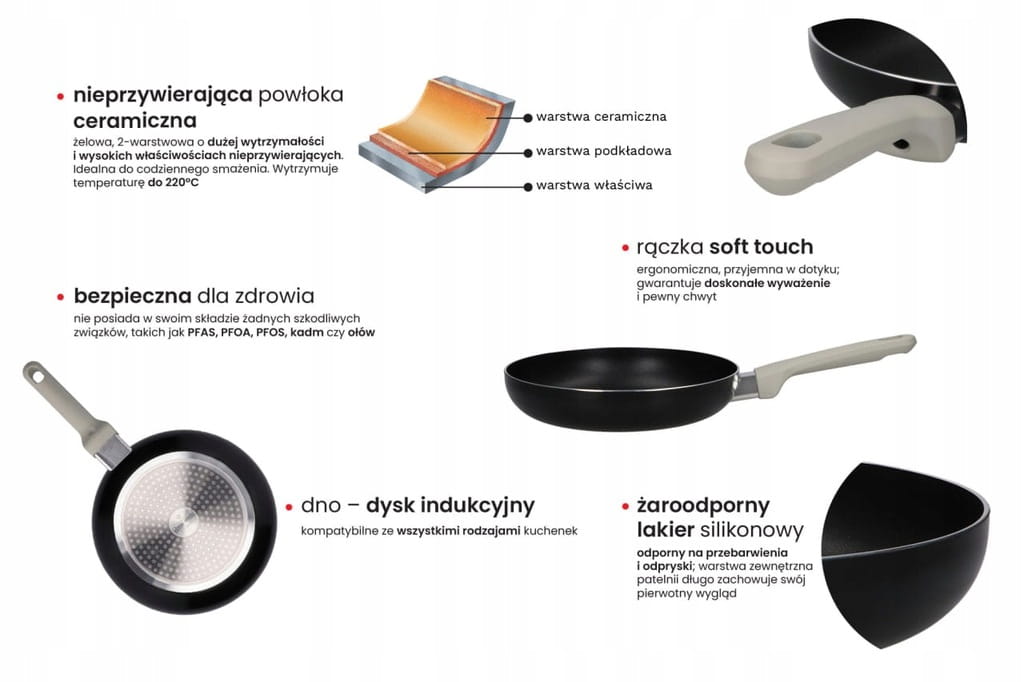 - Powłoka Nieprzywierająca: Wewnętrzna powierzchnia patelni pokryta jest innowacyjną, 2-warstwową powłoką ceramiczną firmy Excilon, która charakteryzuje się dużą wytrzymałością i odpornością na zarysowania. Dzięki temu gotowanie i smażenie staje się łatwiejsze, a czyszczenie – szybsze.