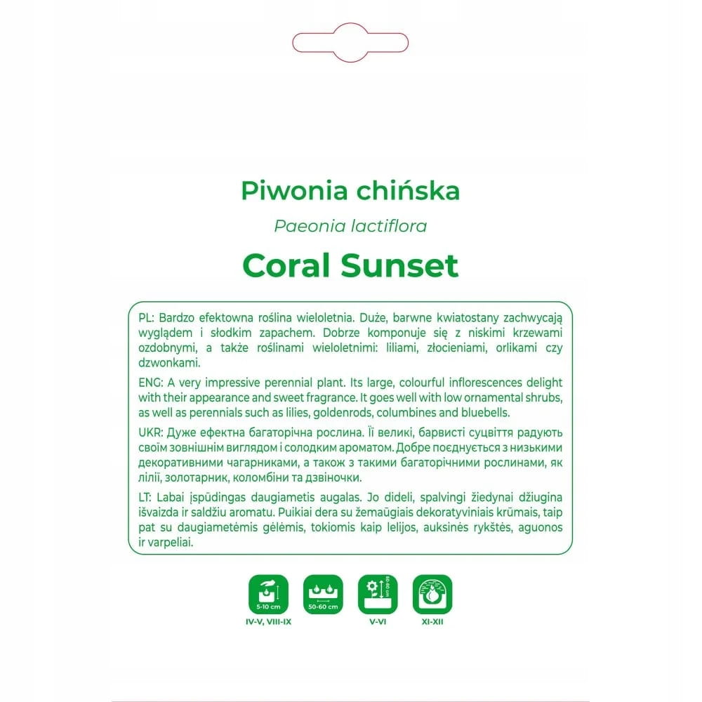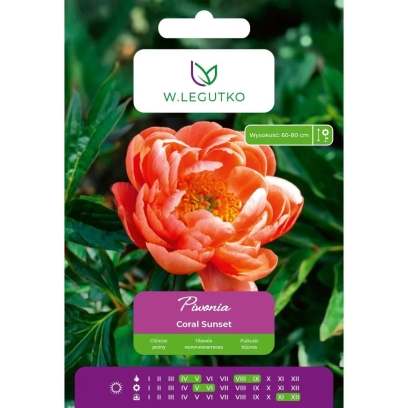 Piwonia Coral Sunset to efektowna, wieloletnia odmiana o wyjątkowej, łososiowo-koralowej barwie kwiatów. Duże, półpełne kwiaty oraz delikatny, słodki zapach sprawiają, że jest to jedna z najbardziej cenionych piwonii do ogrodów przydomowych oraz na rabaty reprezentacyjne.