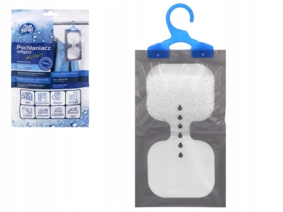 Produkt absorbuje nadmiar wilgoci z powietrza przy użyciu granulatu, który gromadzi wodę wewnątrz opakowania.