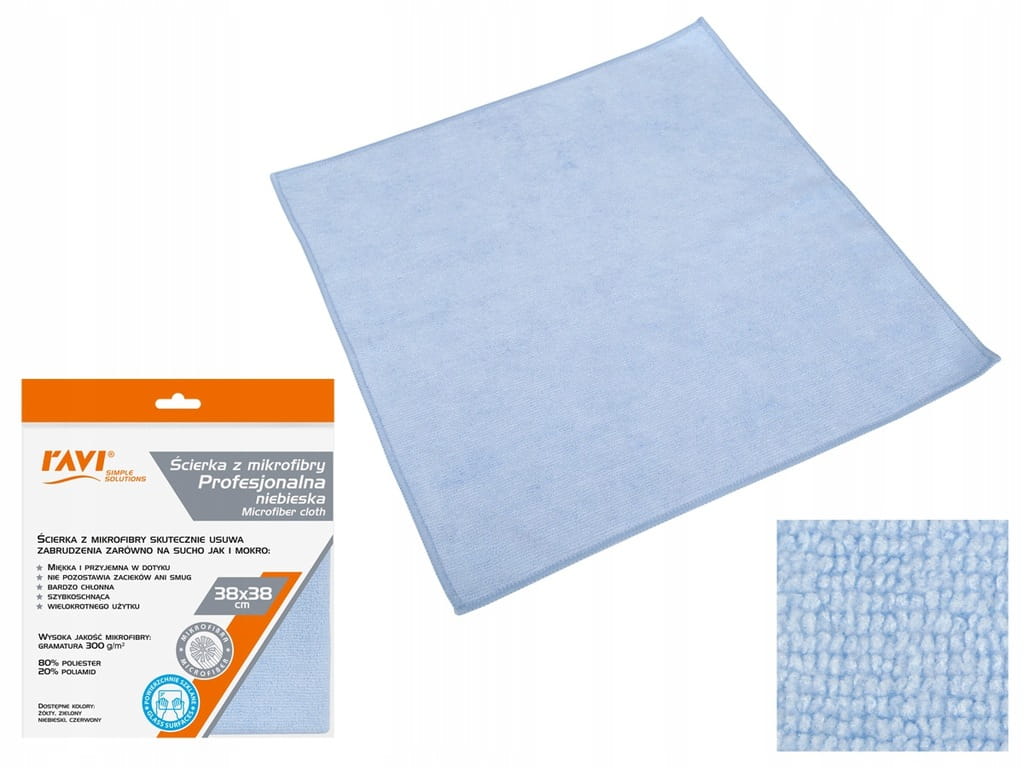 Profesjonalna ściereczka z mikrofibry 38x35 cm w kolorze niebieskim. Niezwykle chłonna i miękka – idealna do czyszczenia kuchni, łazienki, mebli i szyb, bez smug i zacieków.