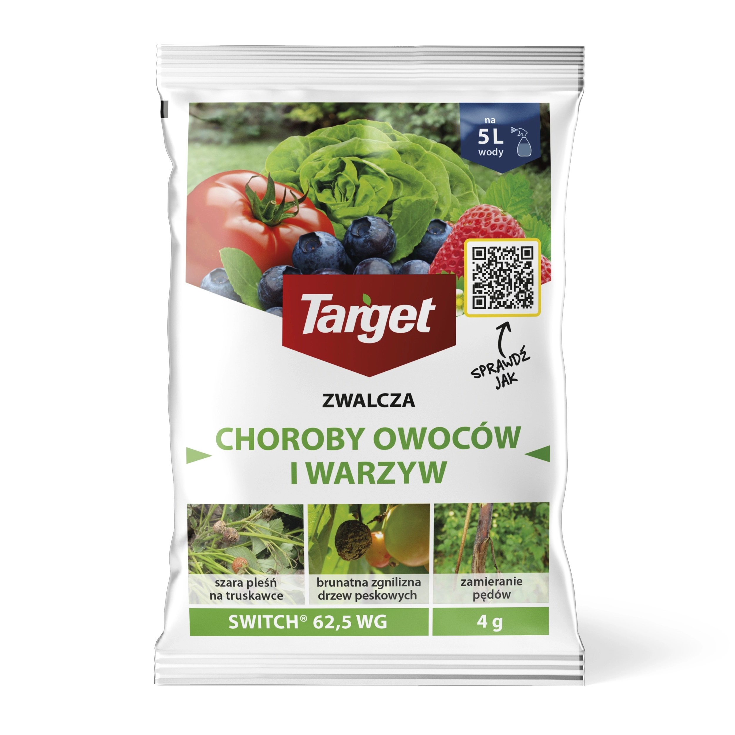 Switch 62,5 WG 4 g Target to nowoczesny środek grzybobójczy w formie granul do sporządzania zawiesiny wodnej, przeznaczony do ochrony roślin sadowniczych, warzywniczych i ozdobnych. Preparat działa wgłębnie i kontaktowo, dzięki czemu może być stosowany zarówno zapobiegawczo, jak i interwencyjnie w zwalczaniu wielu chorób grzybowych.