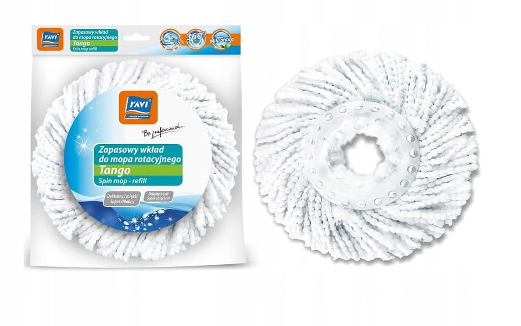 Wkład mikrofibrowy do mopa obrotowego Ravi Tango. Wysoce chłonny, idealny do mycia podłóg, paneli i płytek. Usuwa brud, kurz i nie zostawia smug.