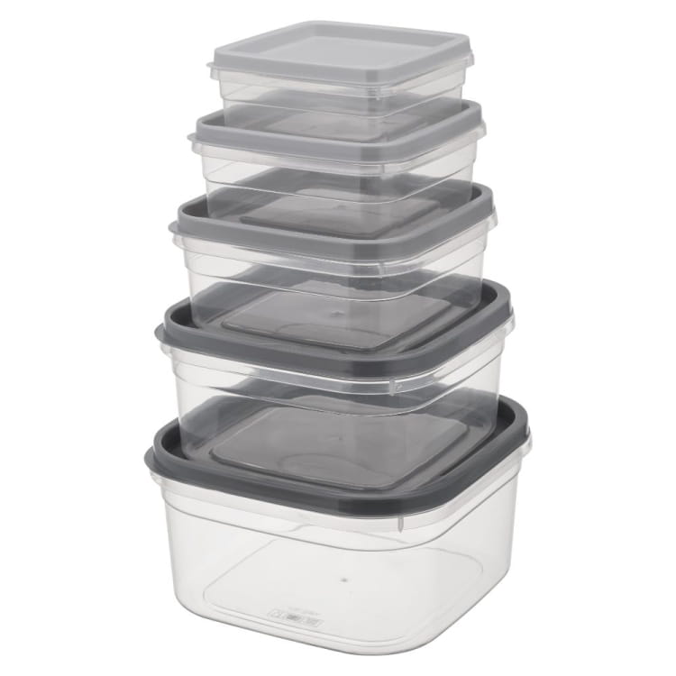 Zestaw 5 kwadratowych pojemników do żywności wykonany z mocnego i trwałego tworzywa to idealne rozwiązanie do przechowywania, mrożenia i transportu jedzenia. Kolorowe pokrywki ułatwiają dopasowanie i porządkują przestrzeń w kuchni.