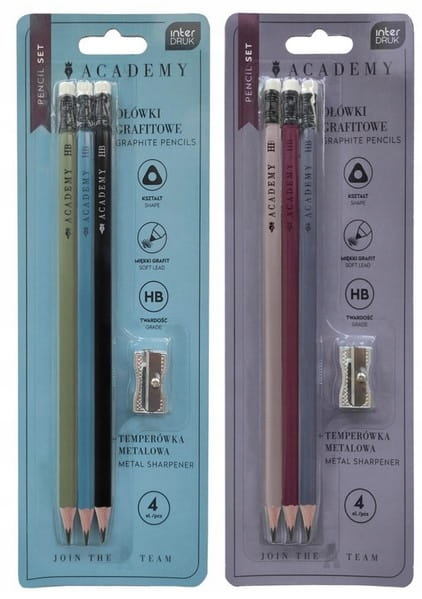 Zestaw Piśmienniczy ACADEMY – 3 ołówki grafitowe + metalowa temperówka