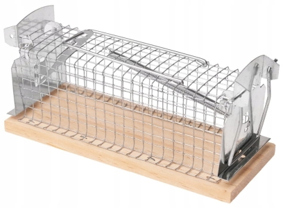 Żywołapka posiada metalową kratę i mechanizm sprężynowy oraz solidną drewnianą podstawę.
